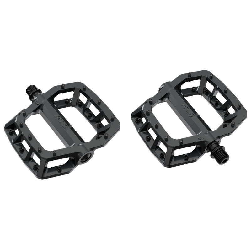 Platformové pedály KLS FLAT 50 023 mají ergonomický tvar, který poskytuje dobrou přilnavost a zároveň minimalizuje hmotnost těla pedálu. Tělo pedálu je odlito z hliníkové slitiny, díky čemuž je robustní a relativně lehké. CNC opracovaná Cr-Mo oska v kombinaci s 2DU ložisky zajišťuje plynulé šlapání i v těch nejdrsnějších podmínkách a dlouhou životnost. Konkávně tvarované tělo pedálu s 10 piny umístěnými na každé straně pedálu, poskytuje grip i v nejostřejších zatáčkách při jízdě v bikeparcích a na nejtěžších trailech.